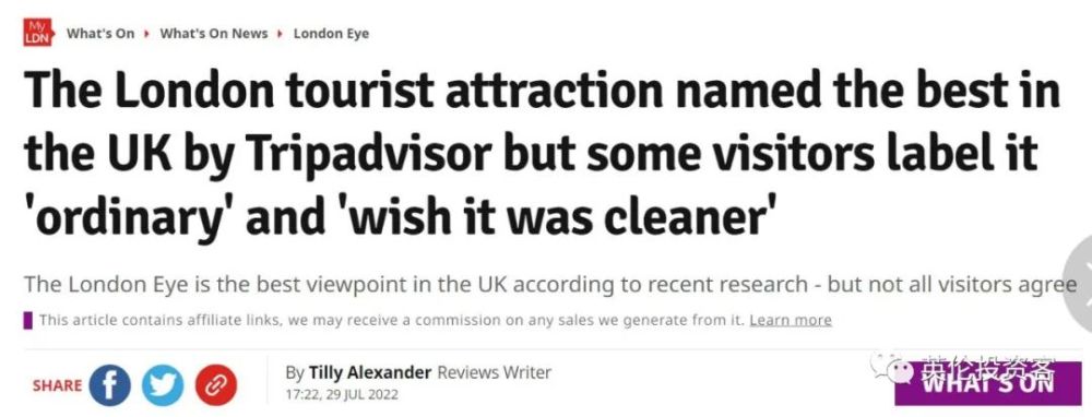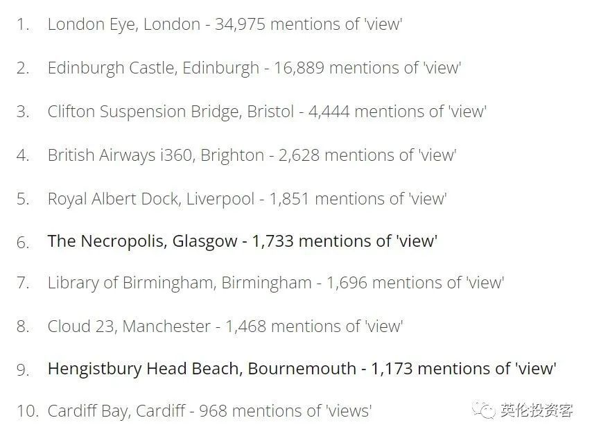 如上图所示,排名第一的是伦敦知名地标——“伦敦眼”摩天轮,成为了英国最受欢迎景点,获得高达34,975次的提及次数(mentions of view)。