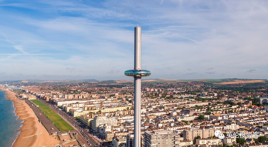 布莱顿的i360移动观景塔由英国航空冠名,可以每次同时将175名游客从海滩上缓慢地运送到138m的高空,每次升空也被称为是一次”航班起飞“。