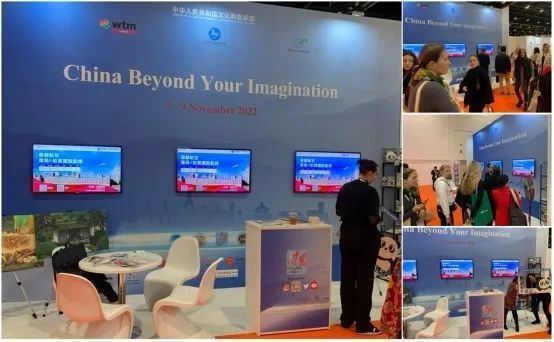 本次展会的中国区展台,由国家文化和旅游部伦敦旅游办事处筹办,并协同包括海南航空、首都航空等在内的国内航司单位联合参展。展台背板设置了3台液晶显示器,轮流播放航司宣传视频和海报,航司人员现场与观众进行互动同时提供国际航线相关的讲解说明。