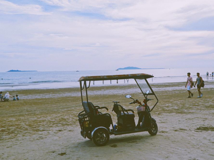 银色的沙滩、蓝色的大海相互映衬,别有一番景致,粉色风车、白色拱门、复古巴士……凹造型必备的拍照道具,在椰林中更具海岛风情。