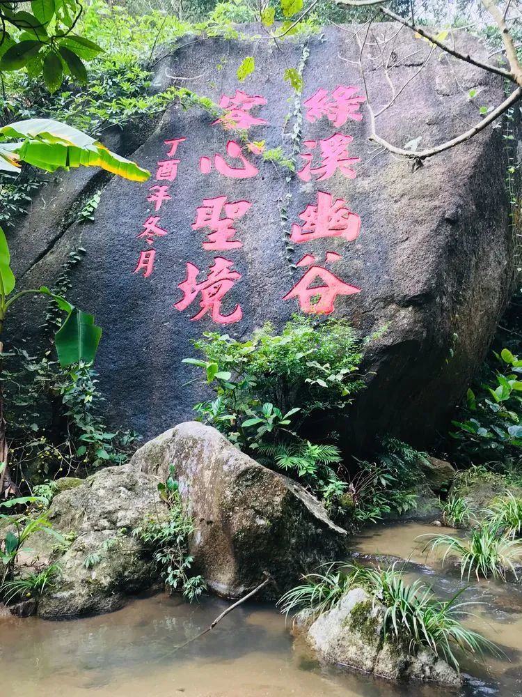 溯溪而上,千姿百态的巨石,星罗棋布,巧夺天工,形态别致,或大或小,争相竞秀,意趣无穷,点缀在岚霭悠悠的绿溪幽谷间。