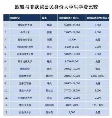 以早些年的剑桥大学为例,非欧盟学生在剑桥的学费一年是16000~38000欧元,换算成人民币大概是12万~29万,而欧盟学生只要9000欧元,大约是7万人民币,可以说是省下了一笔巨款。当然,英国现在由于脱欧的关系,福利这块可能也有所变化,但法国、瑞典、爱尔兰等国家依然是备受欢迎的留学国家。