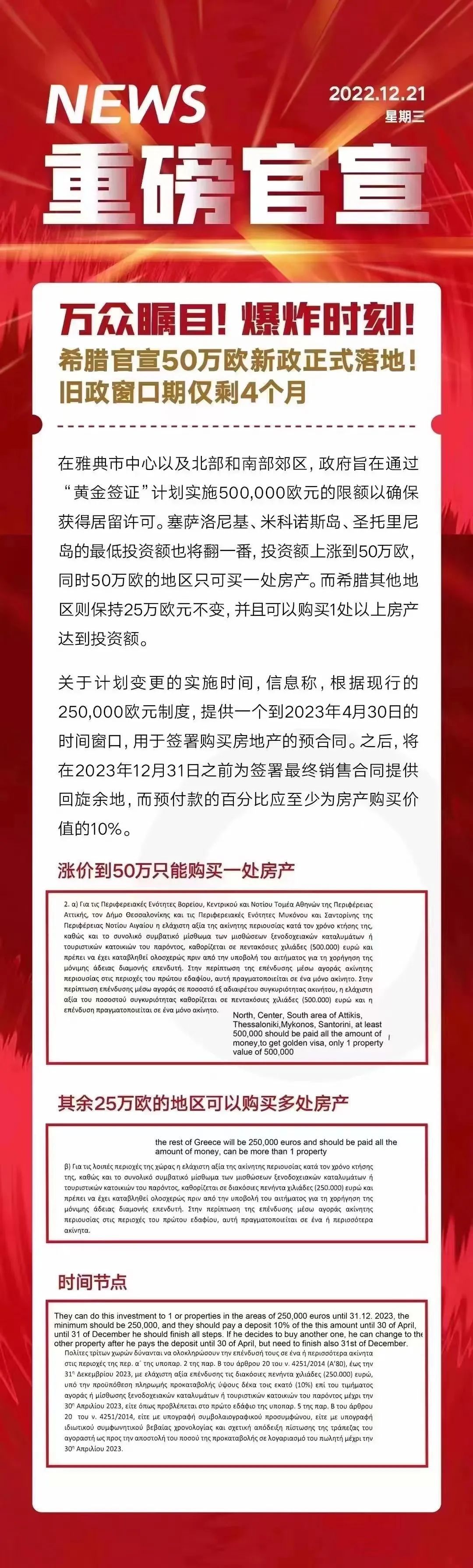 如果您对希腊有兴趣,或者需要一个欧洲身份,那么希腊都是一个很好的选择!趁着25万欧元的窗口期,您可以把握住一个机会抓紧上车。