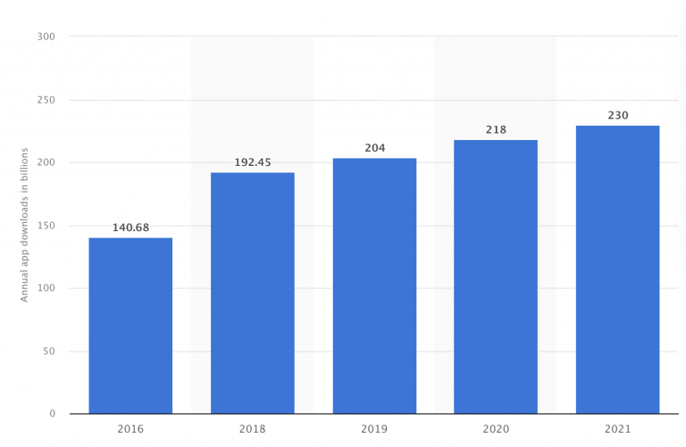 根据 Statista 共享的数据,2021 年,全球用户在其设备上下载了2300 亿个移动应用。