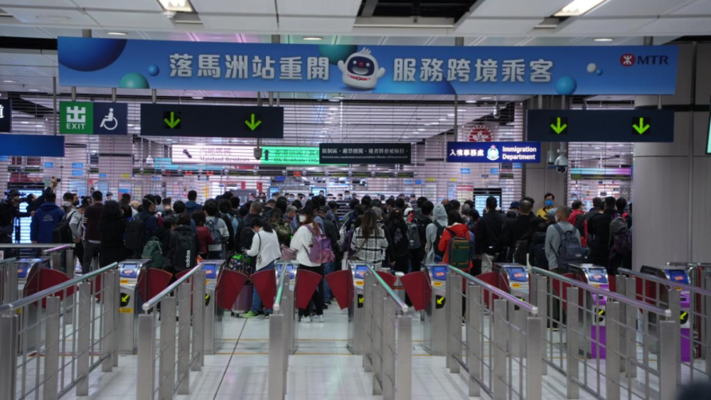 通关前一刻,香港落马洲支线口岸等待过关的旅客