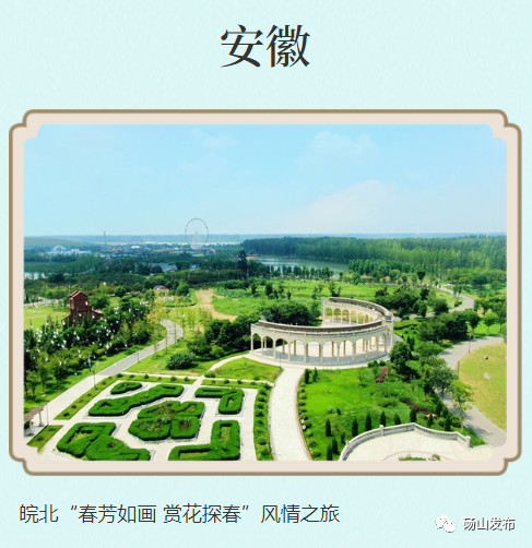 (滁州市)大墅龙山旅游度假区黄栗树风情小镇栗山茶海皇甫山国家森林公园岱山新村大横山风景区黄寨草场八岭生态旅游度假区(蚌埠市)龙子湖风景区蚌埠古民居博览园禾泉米粒花世界花博园涂山禹王宫白乳泉谷阳城樱花园津浦铁路固镇站遗址公园垓下景区沱湖(宿州市)良梨镇葛花滩拓展基地梨树王景区鳌头观海侯楼村皖北农耕文化展览馆魏寨民宿(亳州市)亳州华佗百草园亳药花海休闲观光大世界林拥城药都林海汤王温泉旅游度假区药王村华佗牡丹园亳州北关历史街区涡河水上游涡阳县义门古镇蒙城县恋蝶谷景区蒙城县薛庙村
