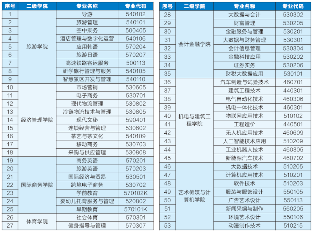 学校拥有文、理、工、艺术、体育等多种学科,设有旅游、经济管理、会计金融、国际商务、机电与建筑工程、艺术传媒与计算机、体育等7个学院,开设有酒店管理与数字化运营、旅游管理、现代物流管理、电子商务、大数据与会计、金融服务与管理、国际经济与贸易、商务英语、汽车制造与实验技术、建筑工程、广告艺术设计、动漫制作技术、社会体育等50多个专业。学校与英国南兰克郡学院、与美国夏威夷大学卡比奥拉尼学院开展中外联合办学,开办了旅游管理(中英)、电子商务(中英)、国际贸易(中英)、旅游管理(中美)等四个专业。