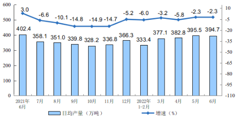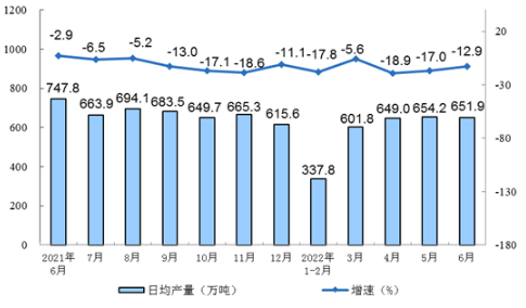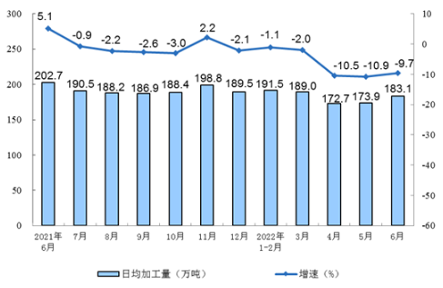 2021年6月-2022年6月原油加工量同比增速及日均加工量