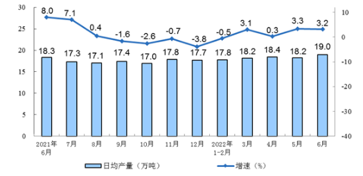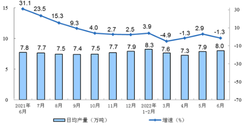 2021年6月-2022年6月钢材同比增速及日均产量