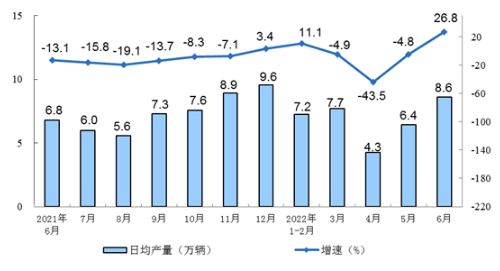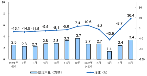2021年6月-2022年6月汽车同比增速及日均产量