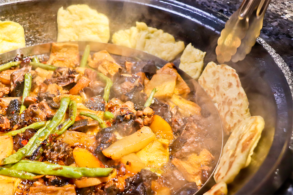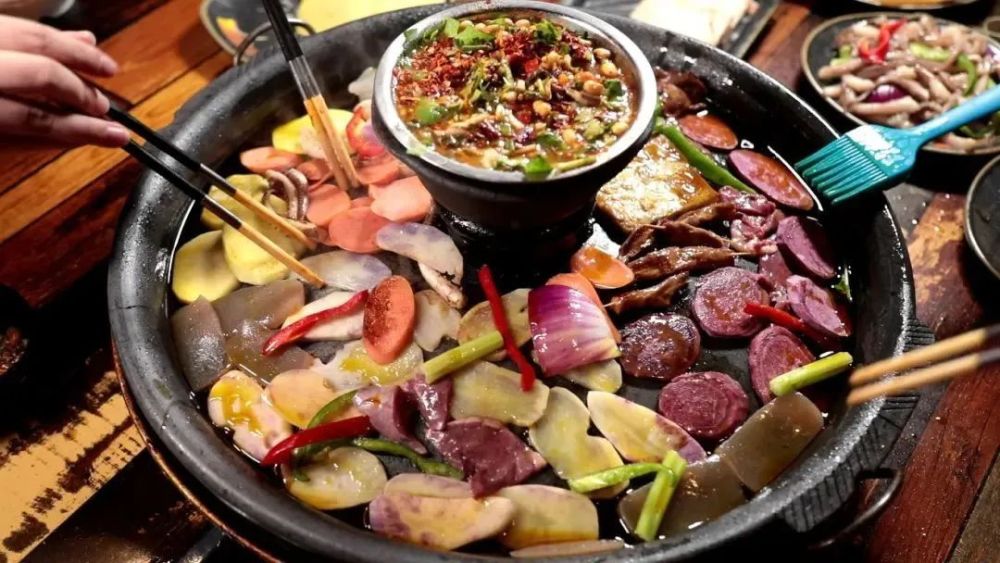 一口土砂锅,一碗活油蘸水,这就是活油烙锅。烙锅堪称“无所不烙”,无论是什么食材,都能在这方天地间发挥出极致美味。烘锅逐渐加热,高温下的蘸水咕噜咕噜,猪油便“活络”开来,融在蘸水中的活油口感鲜活,富有层次。