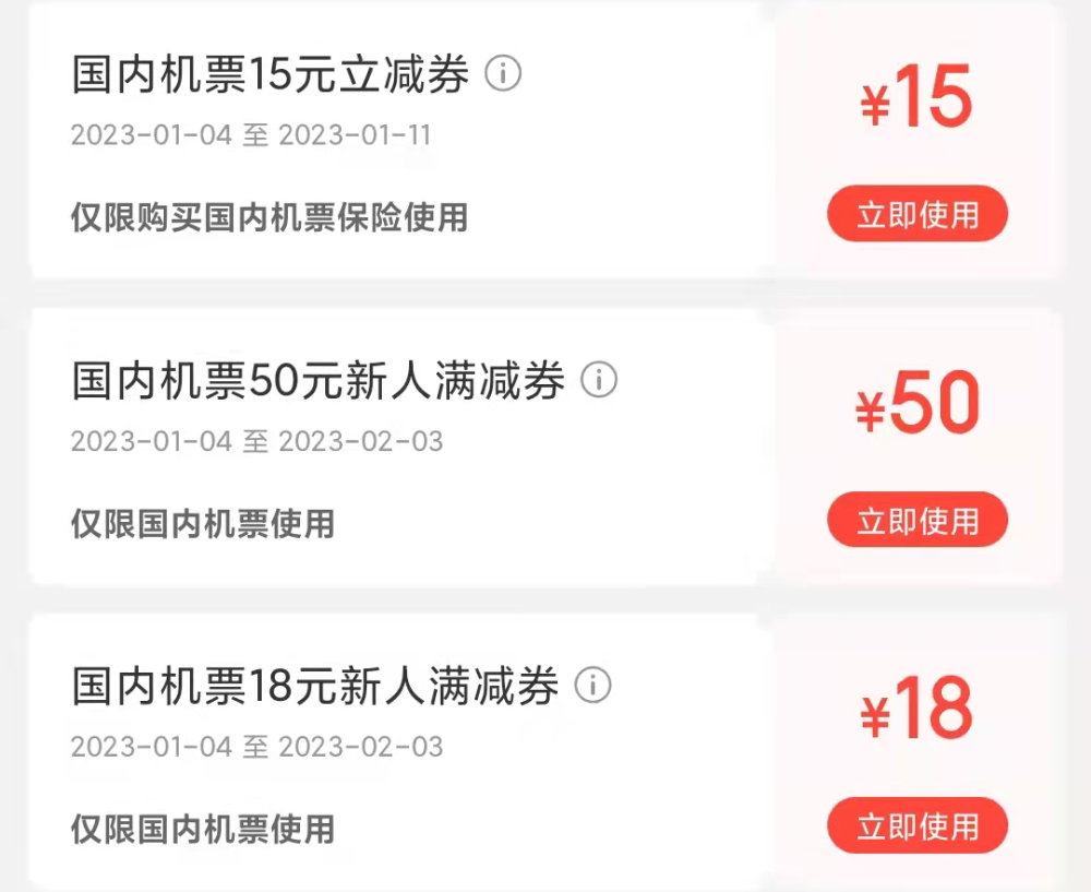 ?机票50元、18元、15元立减券、