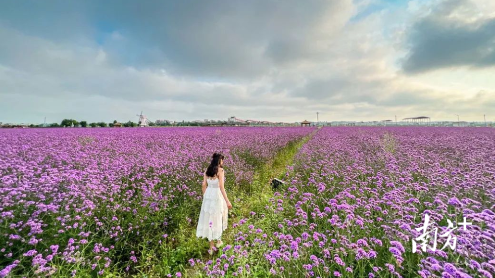 吴川黄坡镇大枚陈村郊野,千亩柳叶马鞭草花海绽放,吸引众多市民前来花海中游玩。