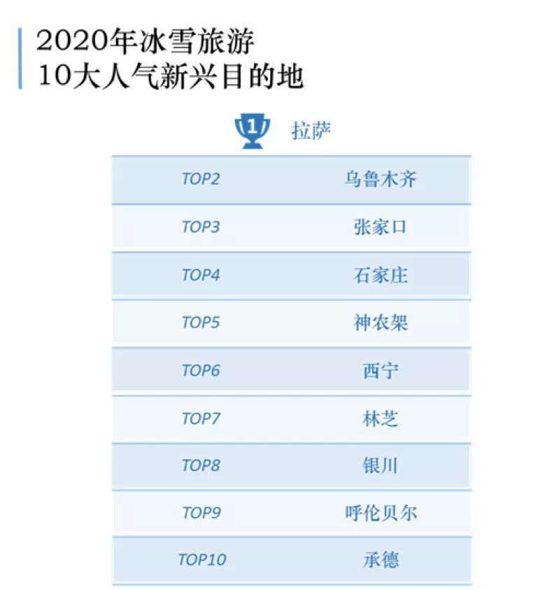 除了传统的冰雪旅游目的地,还有哪些新兴的人气目的地呢?根据预定数据,2020年冰雪旅游人气新兴目的地排名前十的分别是拉萨、乌鲁木齐、张家口、石家庄、神农架、西宁、林芝、银川、呼伦贝尔和承德。