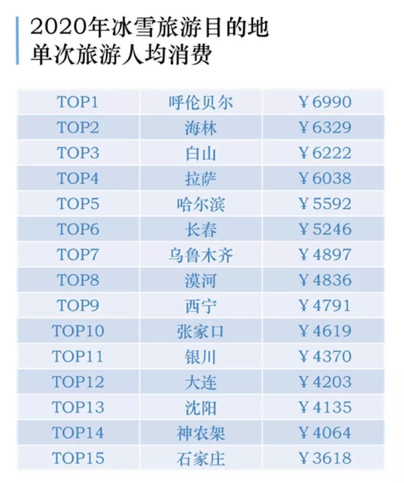 冰雪目的地花费榜单:呼伦贝尔人均花费近7000元