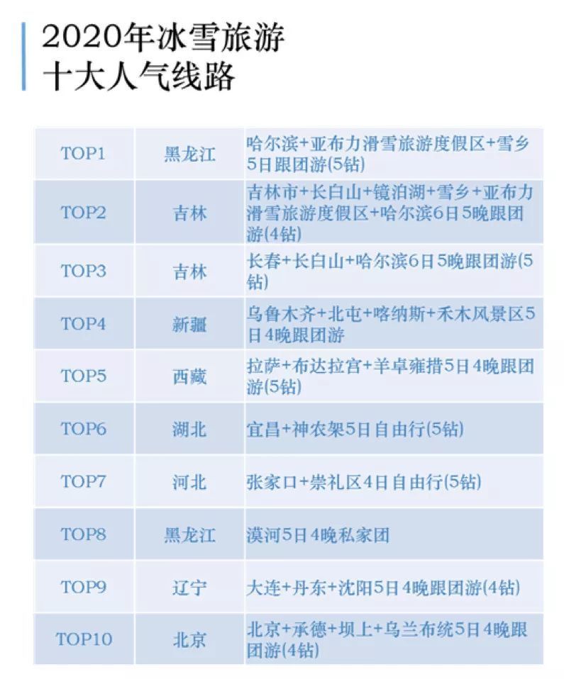 根据跟团游和自由行数据,2020年十大人气冰雪线路分别是哈尔滨+亚布力滑雪旅游度假区+雪乡5日跟团游(5钻) 、吉林市+长白山+镜泊湖+雪乡+亚布力滑雪旅游度假区+哈尔滨6日5晚跟团游(4钻)、长春+长白山+哈尔滨6日5晚跟团游(5钻) 、乌鲁木齐+北屯+喀纳斯+禾木风景区5日4晚跟团游、拉萨+布达拉宫+羊卓雍措5日4晚跟团游(5钻) 、宜昌+神农架5日自由行(5钻)、张家口+崇礼区4日自由行(5钻)、漠河5日4晚私家团、大连+丹东+沈阳5日4晚跟团游(4钻) 和北京+承德+坝上+乌兰布统5日4晚跟团游(4钻)。