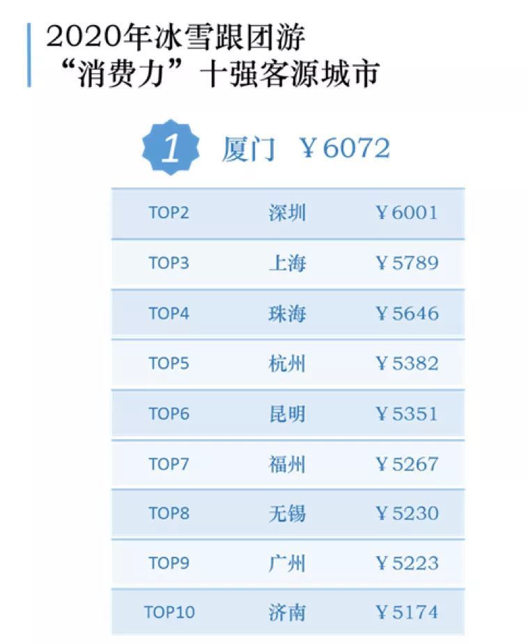 在大部分游客选择的跟团游中,消费能力最强的十大城市是哪些呢?根据数据,厦门的游客以人均消费6072元名列榜首,而深圳游客的单次跟团游人均消费也达到6000元以上,上海和珠海分别以5789元和5646元位居第三和第四,接下来依次是杭州、昆明、福州、无锡、广州和济南。随着冰雪旅游的不断成熟,旅游产品也在不断增多,选择也在不断增多,消费意愿不断增强。