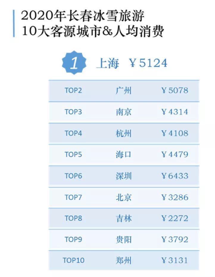 长春作为东北地区典型的冰雪旅游目的地,推出和打造的各类冰雪项目在科技化、高端化、精细化等各方面均实现了大幅度提升,特别是长春冰雪大世界项目填补了长春缺乏一流冰雪景区的空白。哪些游客更爱去长春?根据跟团游和自由行数据,2020年长春冰雪游的10大客源城市为上海、广州、南京、杭州、海口、深圳、北京、吉林、贵阳和郑州。其中深圳居民最舍得花钱,单次旅游人均花费达到了6433元。