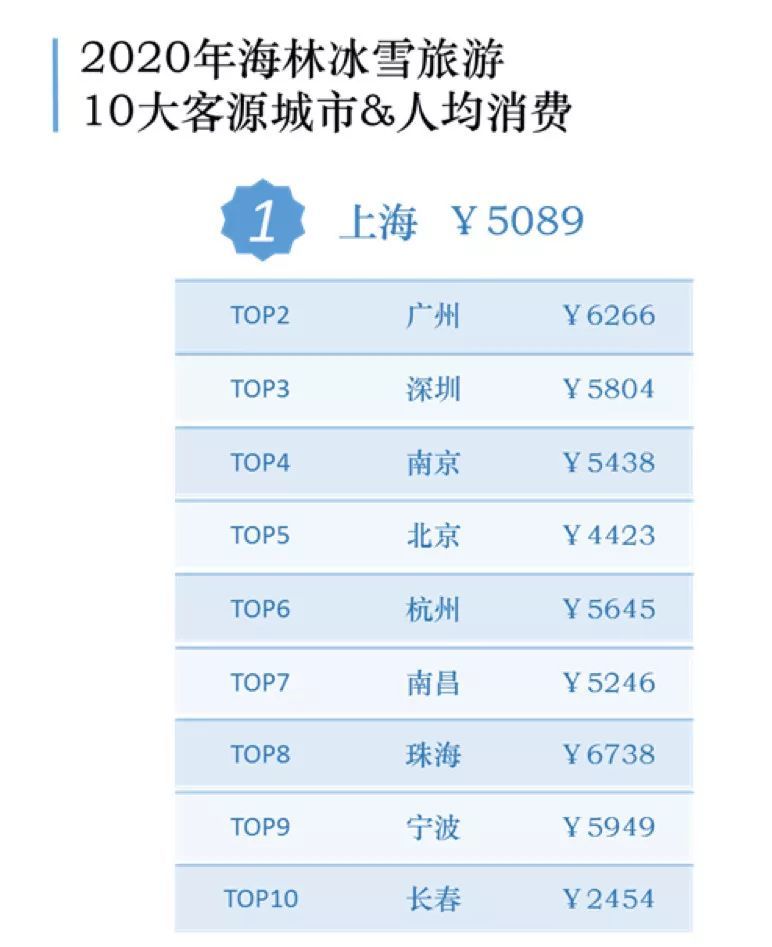 以雪乡闻名的海林,在今年依旧保持着非常高的人气,喜爱前往雪乡的游客都来自哪里?根据跟团游和自由行数据,海林的十大客源城市分别是上海、广州、深圳、南京、北京、杭州、南昌、珠海、宁波和长春。来自广州的游客位居海林冰雪旅游消费榜首,人均消费达到了6266元。