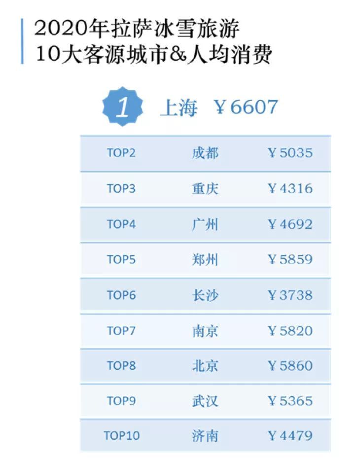根据跟团游和自由行数据,拉萨的十大客源城市分别是上海、成都、重庆、广州、郑州、长沙、南京、北京、武汉和济南。在拉萨,上海居民更舍得花钱,人均消费达到了6607元。