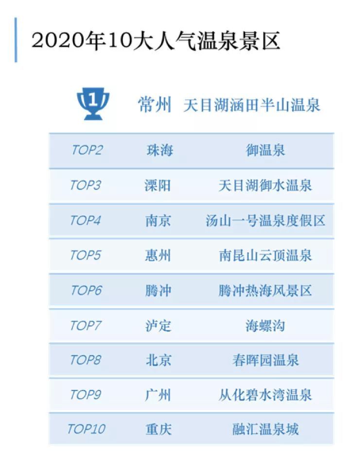 冬季旅游除了赏雪、赏冰、滑雪,泡温泉也是重要主题,根据全球玩乐平台数据,2020年人气最高的温泉景区分别是天目湖涵田半山温泉、御温泉、天目湖御水温泉、汤山一号温泉度假区、南昆山云顶温泉、腾冲热海风景区、海螺沟、春晖园温泉、从化碧水湾温泉和融汇温泉城。