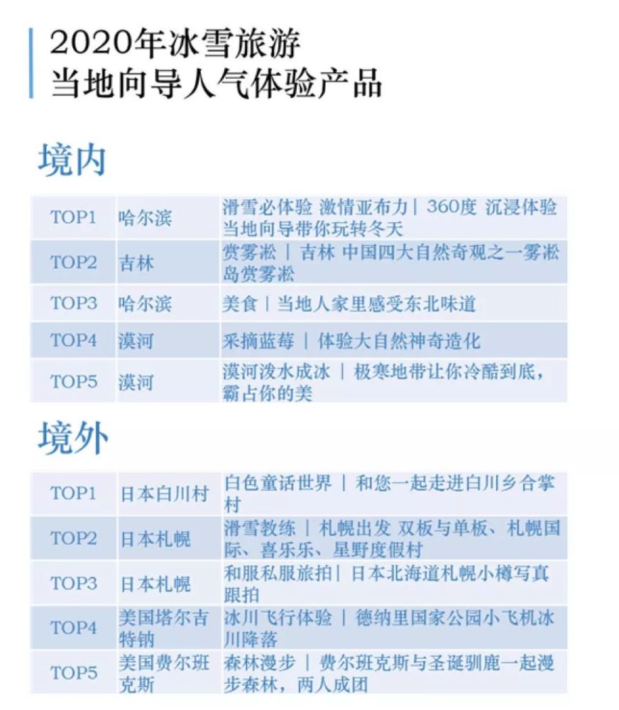 根据携程当地向导数据,在东北品尝美食、采摘植物、体验泼水成冰,是境内的消费热点。在境外,前往日本进行乡村体验、和服私拍,在美国进行森林漫步,是出境游的网红打卡项目。