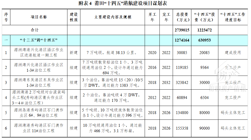 积极开辟对台航线和内贸航线并加密航班,探索开行中欧班列,打造“一带一路”互联互通枢纽;以东吴港区为核心,打造东南大宗散货枢纽港,充分把握湄洲湾港40万吨铁矿石码头列入国家布局有利契机,强化东吴港区主枢纽港核心港区战略地位,推动各港区分工协作、专业发展,发挥整合效应;集中力量加快东吴港区、兴化港区、秀屿港区集约化、现代化、规模化建设,提升航道等级规模和通航能力;以临港产业为支撑,建设海西产业集群工业港,推动临港产业发展,加快推动福建(莆田)国家新能源产业创新示范区建设,哈纳斯莆田液化天然气(LNG)项目码头工程建设;以妈祖文化为纽带,发展世界文化旅游港,拓展港口旅游客运功能,推动水路客运体系优化,加强构建秀屿、湄洲岛、南日岛旅游航道,进一步完善旅游基础设施;加快港区配套设施和后方集疏运铁路建设,拓展对内通道与内陆腹地辐射范围,提升整体竞争力。重点建成兴化港区涵江作业区1-3#、秀屿港区莆头作业区3-4#泊位、秀屿港区石门澳工业园区配套码头泊位等工程,开工(复工)建设东吴港区东吴作业区1-3#、4-6#泊位、秀屿港区石门澳作业区7#、8#、10#、12#、莆头作业区5-6#等泊位工程,启动海域已获批、手续完备的罗屿作业区11-15#泊位建设。加强仙游枫亭作业点3000吨级散货泊位、15公里3000吨级进港航道。