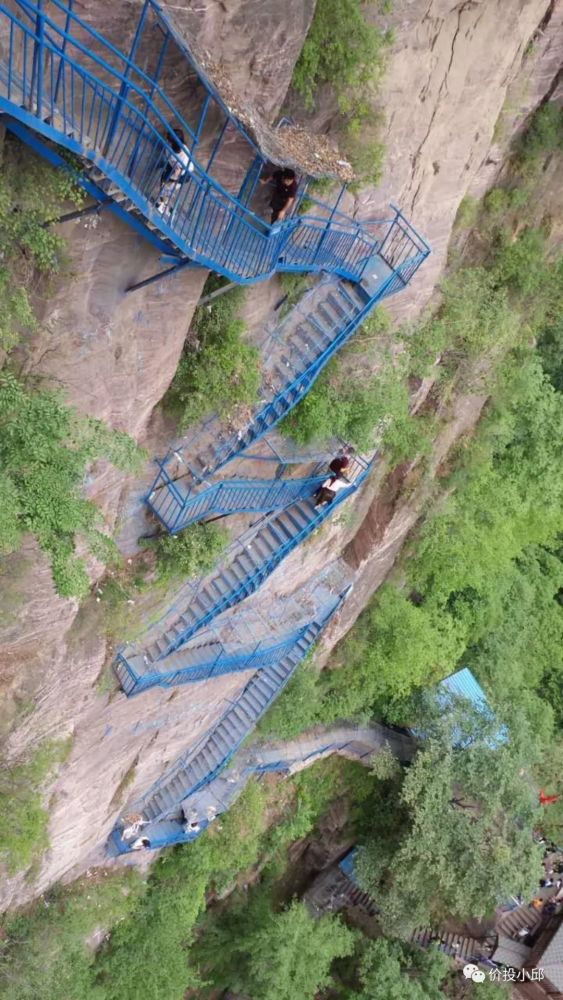 八里沟上下有4种方式,绝壁电梯(40元一人),一线天(免费),绝壁天梯(20元一人),还有点将台(免费),我们选择了期待已久的绝壁天梯,远远的我们就能看见绝壁天梯悬挂在绝壁上,八里沟景区也有不少住宿,绕了好大一圈才走到绝壁天梯。绝壁天梯是用蓝色的铁铸在壁上的楼梯,往上走还好,往下走一直要看下面的风景,还有有点可怕的,虽然我们不恐高。八里沟景区有很多人来游玩,因为这里有瀑布,人工湖,在这北方也是难得。拖着沉重的身体,一步步向大门走去,八里沟在我们看来就是从瀑布到大门有4公里,也就是8华里,又是在山谷之间间,也就是八里沟的取名方式了。大概下午2点多到八里沟大门,到大门后就有班车可以回 辉县 ,坐在回 辉县 的汽车上,往回就是九莲山风景区的大门,两个景点挨得如此近。