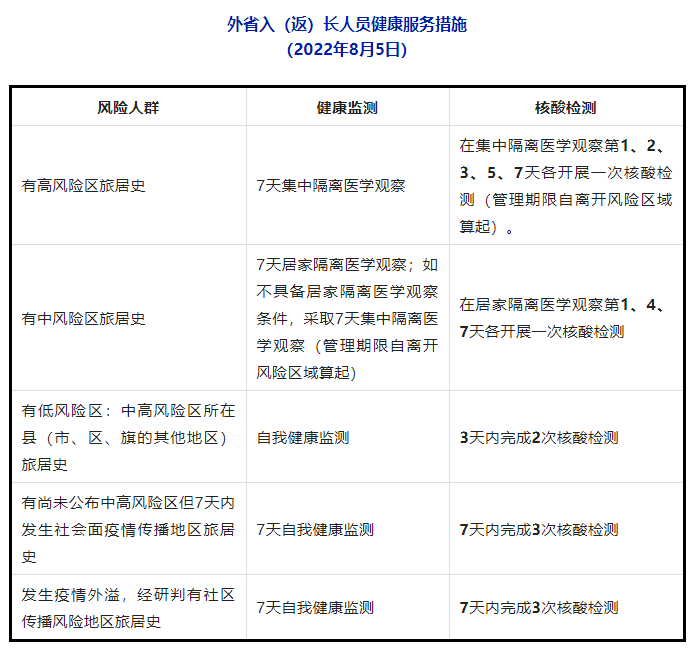 所有外省来(返)长人员请提前2天通过“我的长沙”APP或“我的长沙”小程序进行报备,来(返)长应持48小时内核酸检测阴性证明。无48小时内核酸检测阴性证明或从有本土疫情发生省份来(返)长的人员应在第一入湘地实施落地核酸检测。所有外省来(返)长人员抵长后应主动落实相应的防疫管理措施。