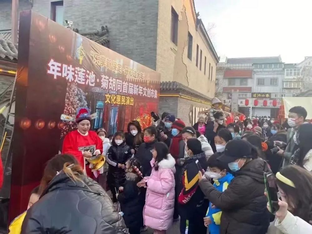 2022年的最后一天,伴随着叮叮咚咚的锣鼓声和龙狮的舞动,“年味莲池”菊胡同首届新年文创市集开市试运行。