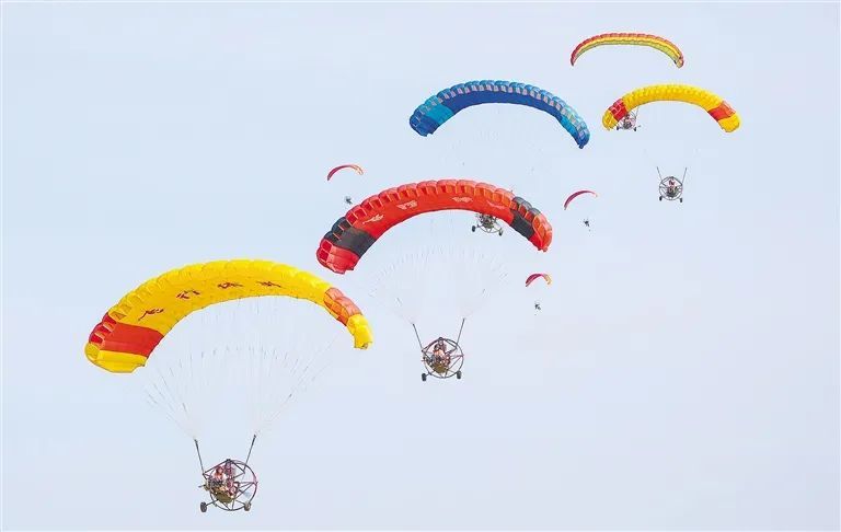 2020环海南岛飞行大赛·海口站动力伞魅力海岸锦标赛开幕式上的动力伞飞行表演。宋国强?摄