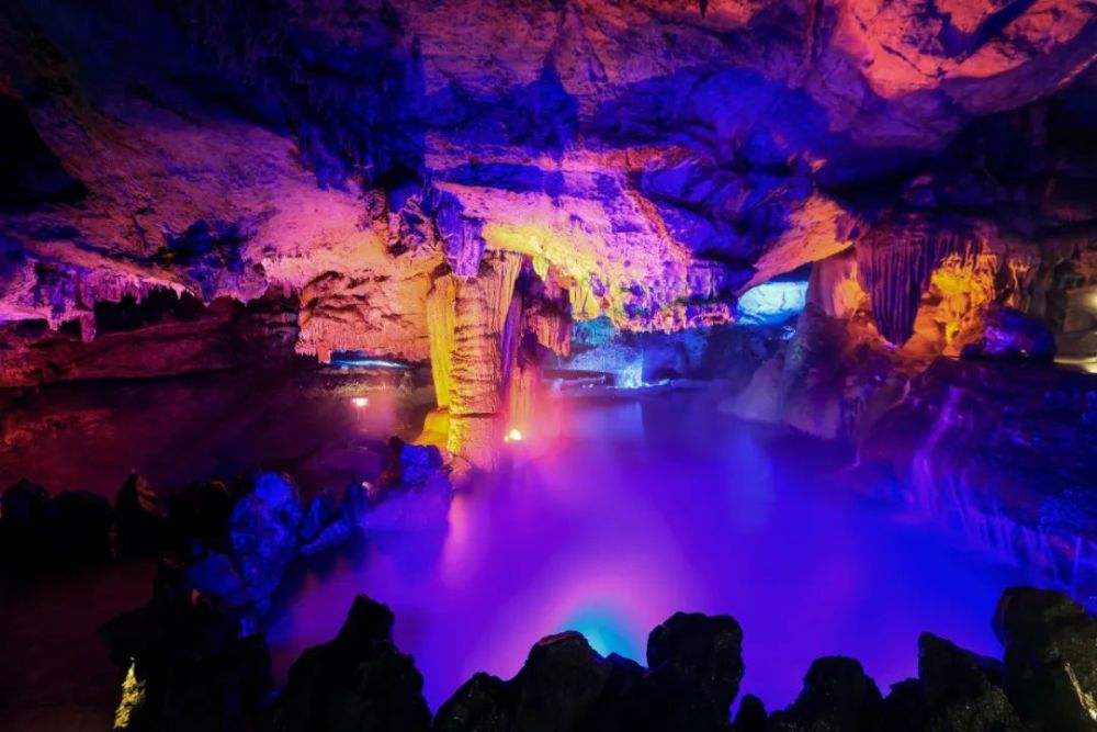 紫气环绕的洞口,神秘而引人入胜,洞内千姿百态的钟乳石景物玲珑有致,悬空景观气势滂沱,铸就一个个梦幻的洞府仙境,在暗河的倒映下栩栩如生,身处溶洞之中,不觉已成仙人!