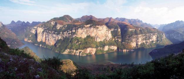 六广河大峡谷全长42公里,上自六广河特大公路桥下,下至姊妹峰。站在峰顶往谷底看去,六广河像一条碧绿透明的绸带,飘然于群山峻岭之间,或隐或现,或明或暗,使人有一种神秘莫测的感觉;从谷底向上看去,奇峰连天,白云缭绕,时而天低云淡,时而一线见天,仿佛置身于天地山水之间。