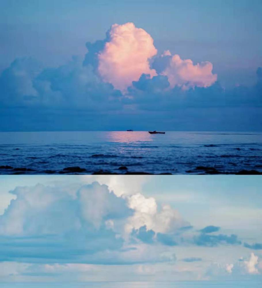 关于云朵和天空的颜色,我偏爱浅色的奶油蓝。沙滩沙粒绵延连着近岸礁石,又是我爱的,还在这里等日落。傍晚七点,云朵和天空的颜色每一分钟都在变幻。