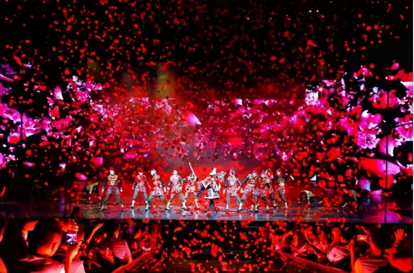 360度全景剧幕层出不穷,400平方米的巨型悬空透明膜从天而降,4700位观众伸手与头上的比基尼美女零距离互动,让每一寸角落都满盈着演出怒放的张力,撼动着观众的视觉与听觉神经。