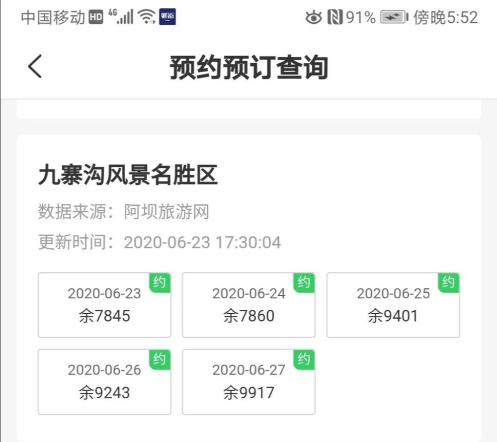 截至6月23日18:00,九寨沟景区门票实时预约情况。(来源:“智游天府”文化和旅游公共服务平台)
