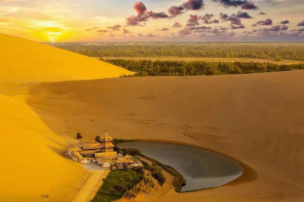 “晴空万里蔚蓝天,美绝人寰月牙泉。银山四面山环抱,一池清水绿漪涟!”?澄黄的鸣沙山和清澈的月牙泉泉水相互依存,那奇异迷人的景色延续千年不变。