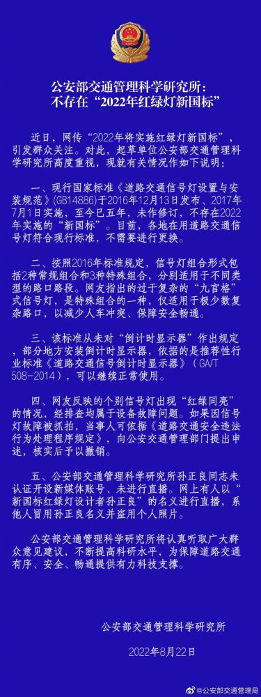 近日,网传“2022年将实施红绿灯新国标”,引发群众关注。对此,起草单位公安部交通管理科学研究所高度重视,就有关情况作说明。