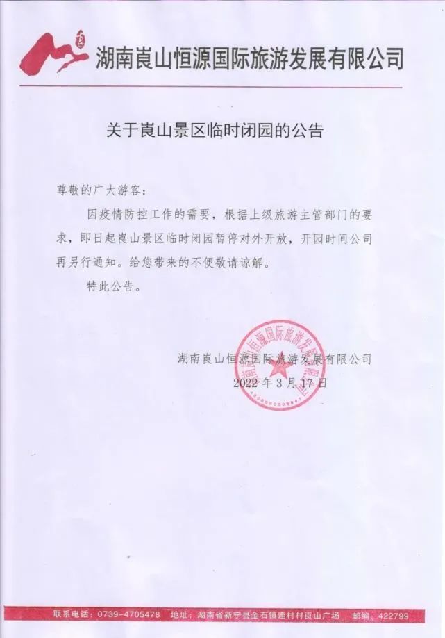 3月17日,邵阳市崀山旅游区发布信息,因疫情防控工作的需要,根据上级旅游主管部门的要求,即日起崀山景区临时闭园暂停对外开放,开园时间公司再另行通告。