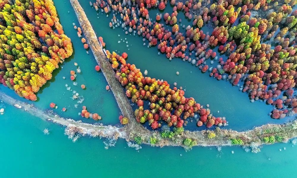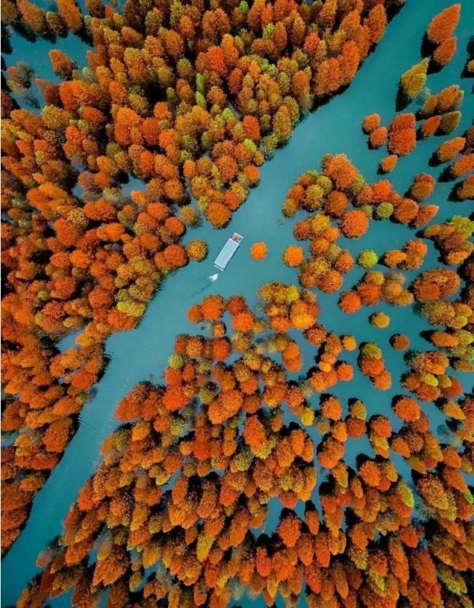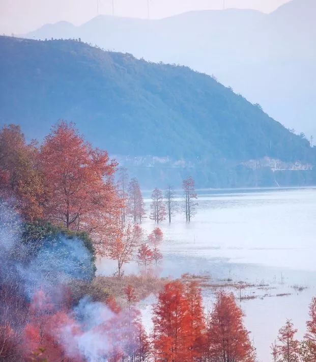 这里还有一个媲美北疆喀纳斯的湖,一到深秋,落羽杉便将蔚蓝色的水“染”红,如莫奈笔下的风光,明亮又热烈。