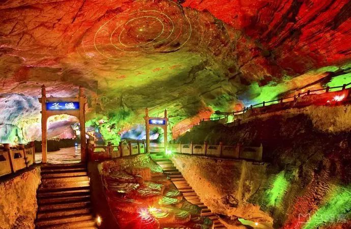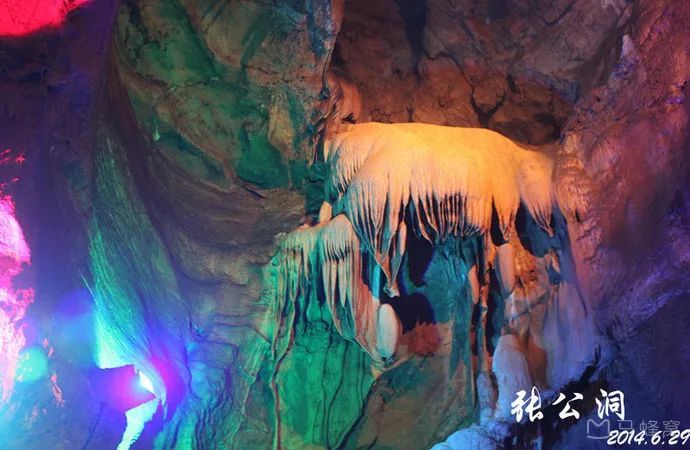 拾级而上到烟雾缭绕的海王厅,也叫“天蓬大场”,是全洞之精华,在灯光的映射下五光十色,据说这儿还是央视版《笑傲江湖》的取景地。