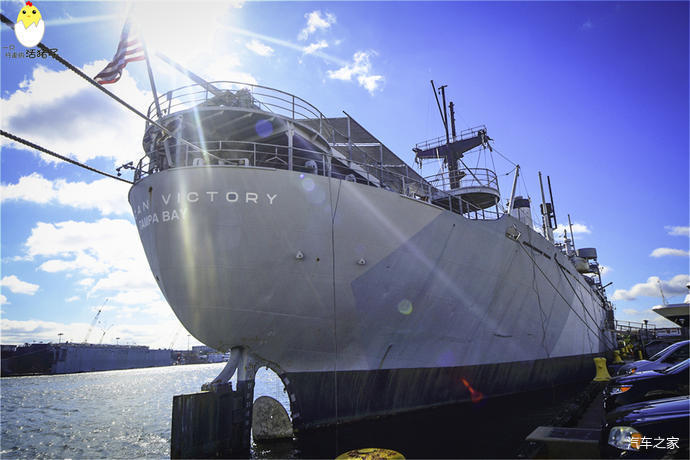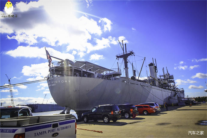 SS美国胜利号货轮:先来科普一下美国胜利号货轮,它是一种在第二次世界大战中在北美的船坞中大量制造的货轮,他们被用来替代那些被德国U艇击沉的船只。胜利轮是在原先自由轮的基础上设计的,整个二战期间一共建造了531艘。而SS这艘主要服务于二战时期的太平洋战争,后来也参与了韩战和越战,现在停靠在坦帕的邮轮码头附近,作为水上博物馆,并且还作为活历史邮轮在开。登上邮轮是需要参加tour的,不想进去的话在外面拍拍照就可以。这艘货轮从外观看上去还是挺新的,银色的表层在阳光下熠熠发光。