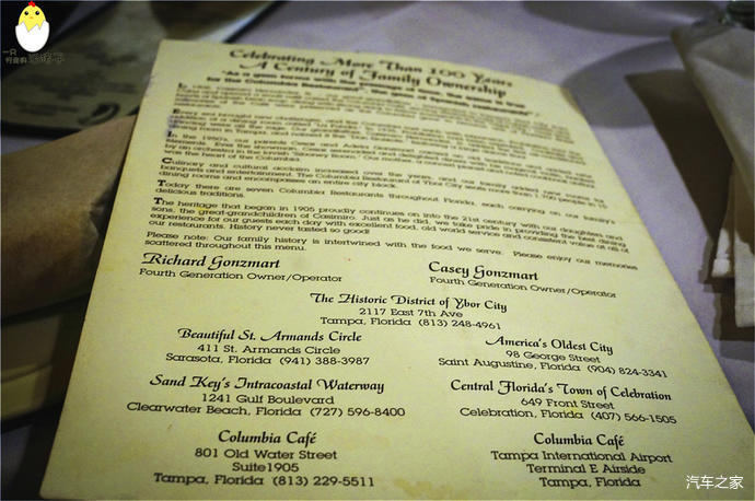 哥伦比亚餐厅可谓坦帕最著名的餐厅之一了。它最引以为豪的就是它悠久的历史,从1905年开始,经营了110周年,经历了五代人。本来想周五晚上去吃,结果发现它家周末晚上的等位一定会超过一个小时。于是退而求其次,选在了周六中午。餐厅在极具古巴风情的特色街区Ybor City里,一开始这家店只是一个小咖啡馆,专卖古巴咖啡和古巴三明治给附近烟厂工人,后来餐厅逐渐扩大,我发现它光是一楼就有整整三个大厅,比一般的美国餐馆要大的多。整个餐厅的装修风格以及配色都极具西班牙风情,外墙的彩绘,门厅的壁画,甚至餐具上的装饰,全都美轮美奂。它的菜单十分有意思。每道菜下面除了详细介绍配料以为,还都附赠一个小故事,例如:这道菜取这个名字是为了纪念我们兢兢业业工作了48年的XX员工。再例如:这道番茄沙拉是我爹和我爷爷最喜欢吃的呀!菜肴融合了西班牙和古巴风味,味道还不错。印象最深的还是特色的西班牙海鲜饭啦,会有亲切的服务员帮你把饭从烫手的铁盘转移到餐盘之中。红橙黄绿煞为好看。甜品点的是Guava Turnover “Carmita”。因为对番石榴Guava这种热带水果比较感兴趣。上来之后发现类似于番石榴派,口味还是比较独特的。因为之前跟他们反映过海鲜饭里有没有滤掉的鸡骨,获赠了一份甜品“White Chocolate Bread Pudding”,小故事里写着这是他父亲和祖父最爱的甜品,比他们去其他地方吃到的都要好。他们选用的是特定烘焙坊的古巴面包,配上浓郁白巧克力,牛奶和鸡蛋也是佛罗里达当地的,最后浇上朗姆酱。可惜我们吃的太饱了,对美食鉴赏能力已然跌倒谷底,只是强行把这个甜甜的东西塞进肚子。不过总体而言甜品的分量都很大,两个人分食就差不多了。