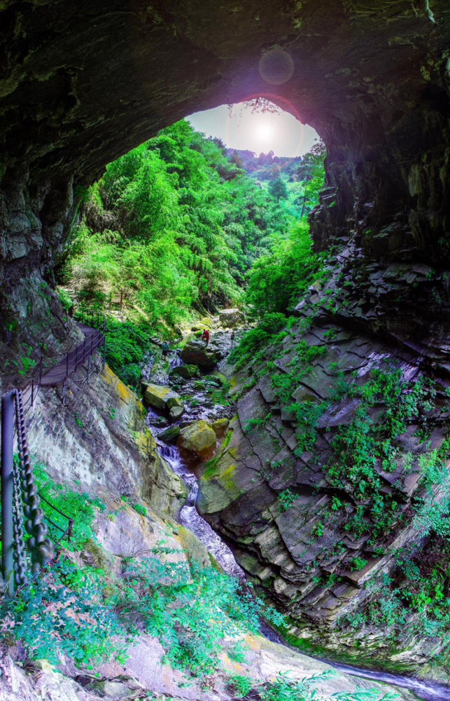 位于鬼溪秘境十里峡谷中心位置,游客服务站距此处2000米,一座天然石门直立于谷溪间,溪水穿门而过,后傍着近两百米的悬崖峭壁飞流而下,形成一条蜿蜒飞龙瀑布,感谢大自然鬼斧神工赐予鬼溪一道精致美景。