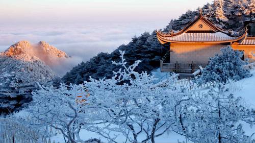 冬季是一年中黄山五绝完美呈现时节,冬雪与松、石、云、泉巧妙结合,配以壮丽日出、绚丽晚霞、晶莹冰挂、琉璃雾凇、罕见佛光,将黄山装扮成绝美的人间仙境。黄山全年平均积雪有50天左右,每年12月至次年2月为最旺雪期,也是冬游的最佳季节。