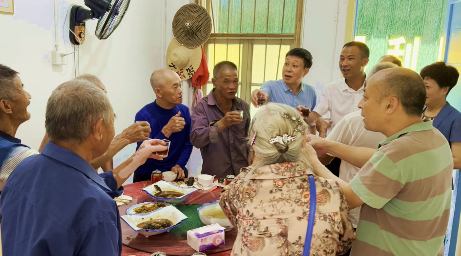 2022年7月27日,水北镇二都村长者食堂揭牌,游立寿和长者们一起祝贺。
