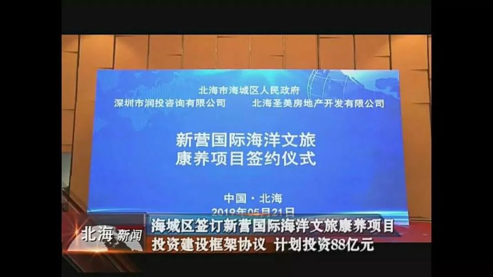 今年5月21日,海城区政府与华润置地广西公司、北海圣美房地产开发有限公司签订投资建设框架协议。按照协议,华润置地广西公司、北海圣美房地产开发有限公司将在海城区投资建设新营国际海洋文旅康养项目,总投资88亿元。