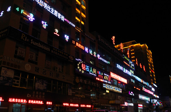 对面有一整片的弹幕墙,