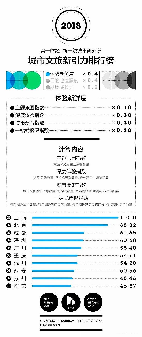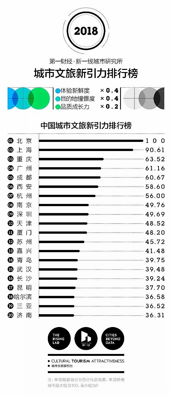 当我们用全新视角,重新盘点中国城市对旅游人群的吸引力,一个首要的原则是综合衡量城市在文化和旅游结合领域的活力。而单纯考量一座城市的旅游人口和城市旅游收入,显然并不适合城市文旅新引力的标准。当然传统的城市接待国内外游客总人数、旅游总收入、人均旅游消费、酒店数量和景点总评,也是构成城市旅游吸引力的重要指标。
