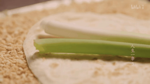 拿一张饼皮,先放上芽葱、再加点辣酱,以及几串烤得滋滋冒油的五花肉,霸气地把铁签撸下来,咬上一口,饼的劲道、葱的鲜甜、肉的焦香一下子在口腔中绽放开来。